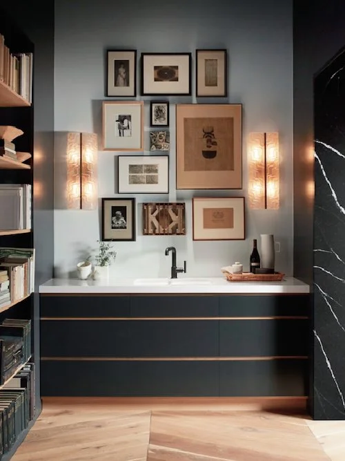 To address the layout and aesthetic, we proposed a neutral color palette with gray cabinetry, helping to conceal bulky elements like the staircase and HVAC system, creating a more streamlined look. We also removed a non-functional and unsightly window on the staircase wall, which not only disrupted the flow but also took up valuable space that could be better utilized for the new coffee zone. For added visual interest, we incorporated color blocking on the windows, creating a focal point that adds depth and contrast.