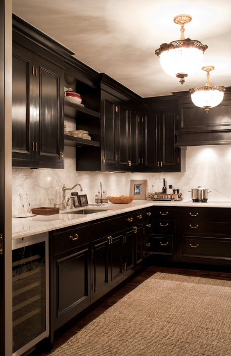 A Calcatta marble slab acts as the countertop and backsplash. This marble creates a uniform look that intrigues with its stark contrast to the dark cabinetry. (Casey Design / Planning Group Inc. - photograph by Ted Yarwood)