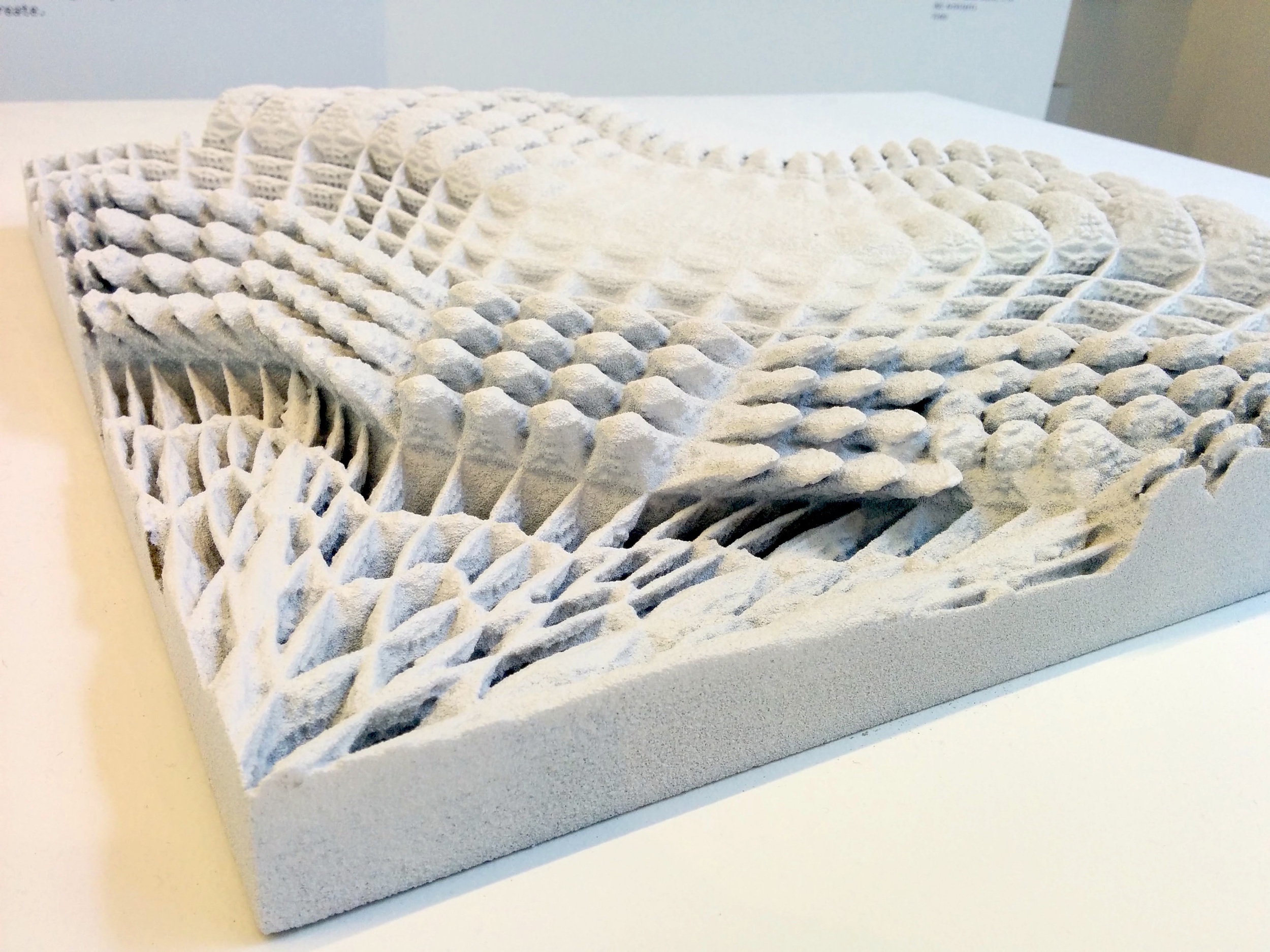 Among the most impressive 3D printed sculptures of the exhibition was the “Salty Gloo,” by Emerging Objects. An igloo-like structure made from 3D-printed salt tiles. The tiles are lightweight and translucent and against the natural sunlight from the window creates beautiful dapple shade on the exhibition ground. The colour of the natural mineral; salt and the unique shape of the tiles is the perfect combination to emit light and shade that feels organic and natural, as if sitting under a tree. This could perhaps not be achieved with conventional building materials. Have a look at the video of the Salty Gloo from the blog of the creators, “Emerging Object.” http://www.emergingobjects.com/projects/saltygloo/